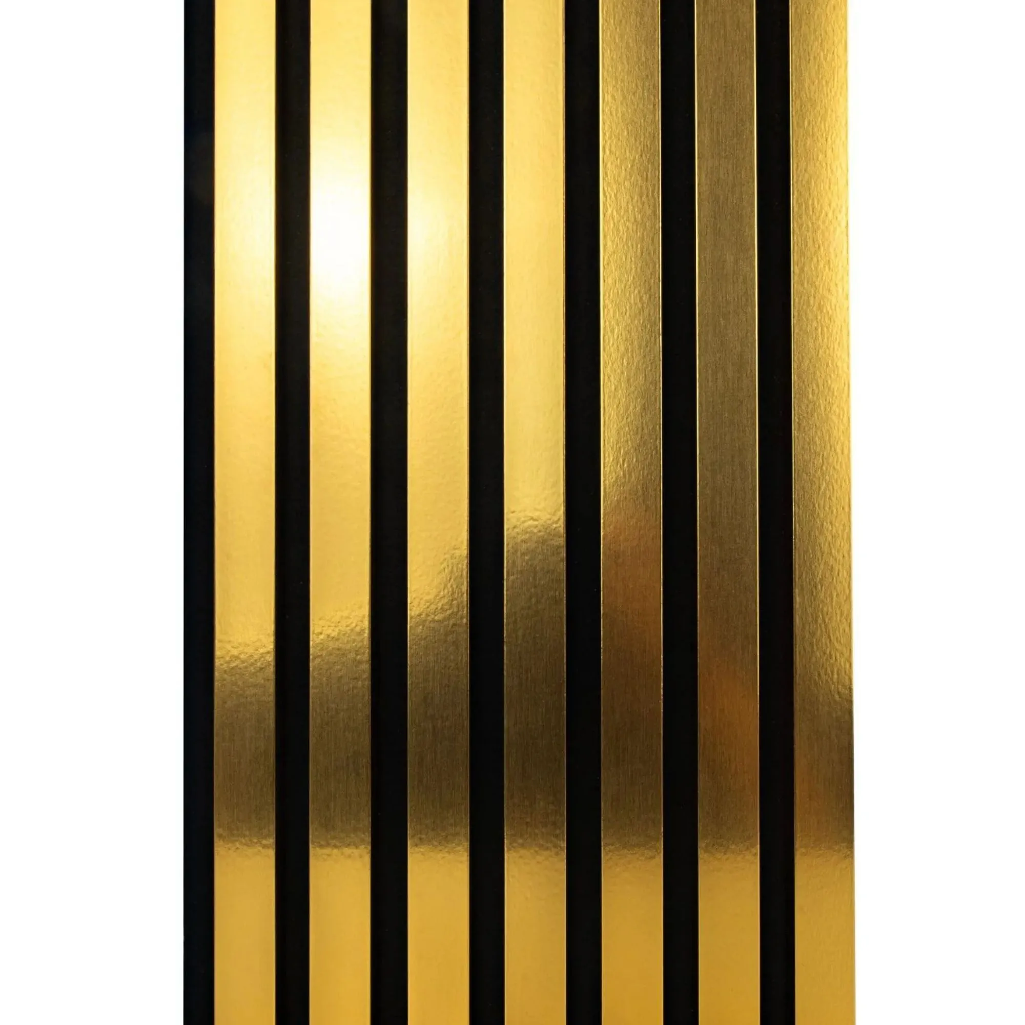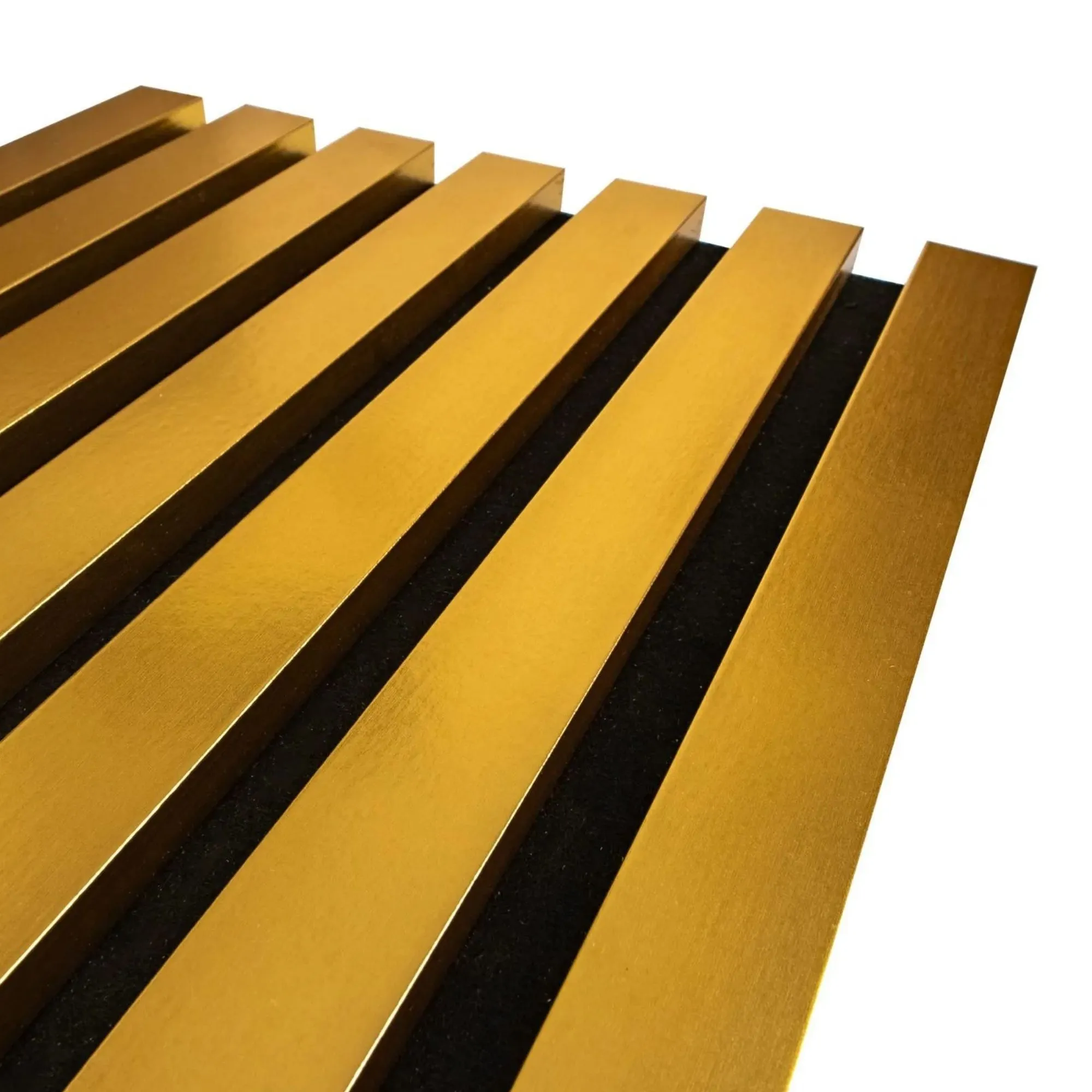 Złote lamele na filcu to nowoczesny sposób na odmienienie każdego wnętrza, ponieważ łączą w sobie elegancję i funkcjonalność. Dzięki wykończeniu w szlachetnym kolorze złota panele stają się wyjątkową dekoracją ścienną, która nadaje pomieszczeniu luksusowego charakteru. Co więcej, ich montaż jest szybki i prosty, gdyż umieszczone są na czarnym filcu, co pozwala łatwo dopasować je do ściany bez konieczności stosowania dodatkowych konstrukcji.