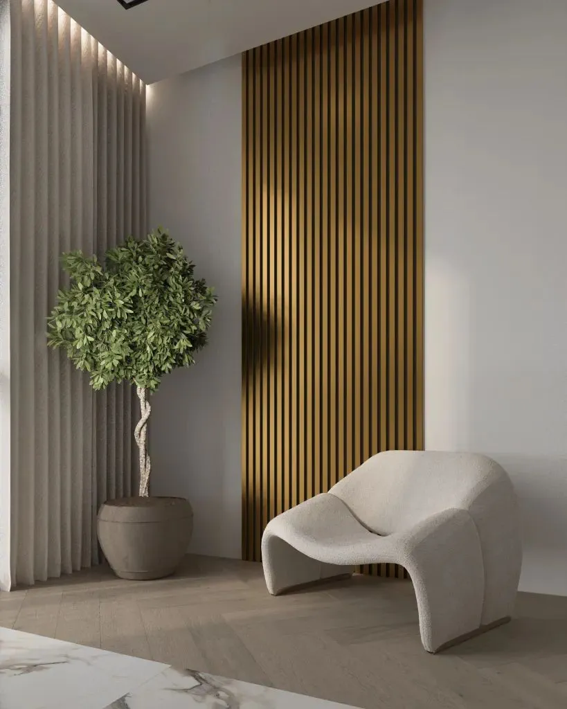 Lamele dekoracyjne w złotym kolorze to sposób na stworzenie wnętrza z charakterem, ponieważ łączą w sobie elegancję i przytulność. Dzięki swojej wyrazistej formie oraz szlachetnemu odcieniowi sprawiają, że ściana staje się centralnym punktem aranżacji i już od pierwszej chwili przyciąga wzrok.