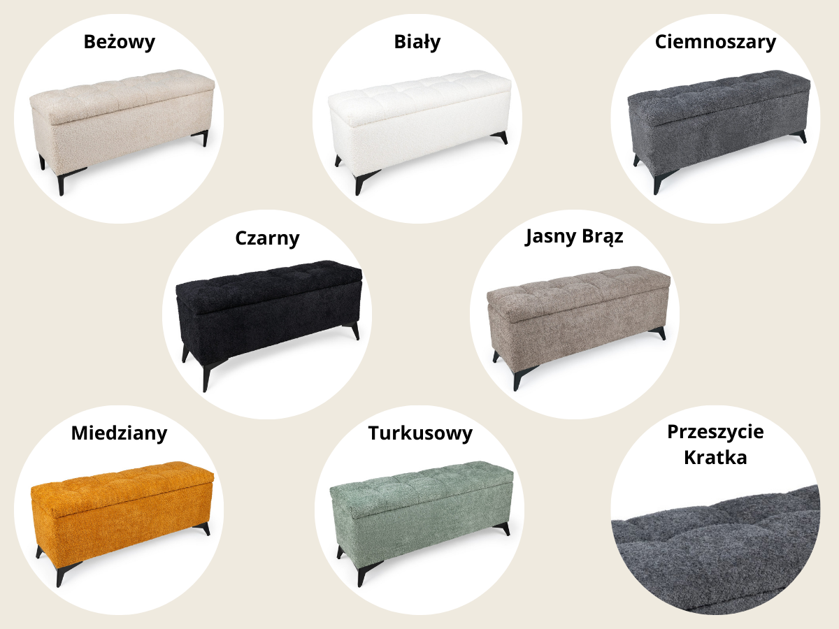 Dostępny w 7 wersjach kolorystycznych bukli oraz w 5 wariantach tkaniny velvet – dzięki temu bez trudu dopasujesz ławkę do swojego wnętrza.